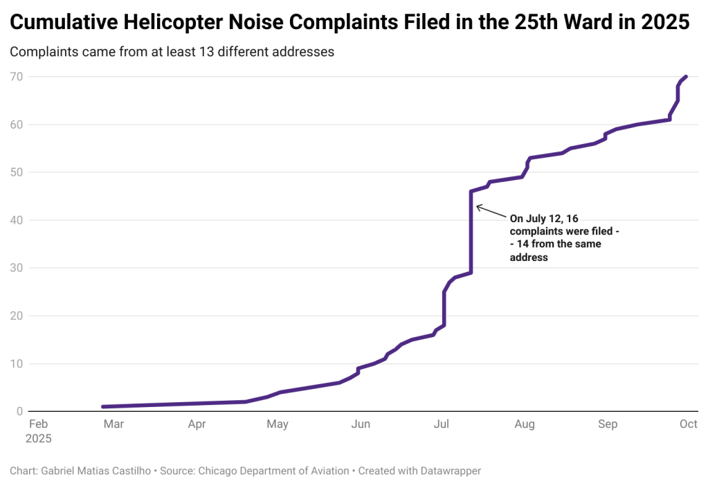 According to the Chicago Department of Aviation, 25th Ward residents filed 70 helicopter noise complaint requests through the CHI 311 service and seven through the Fly Heli Tours website this year. The helicopters, which fly from the Vertiport facility in the 28th Ward, use Pilsen’s airspace to kickstart their tours.