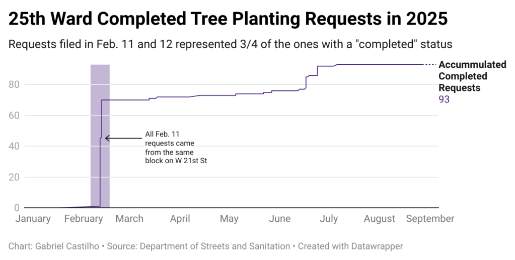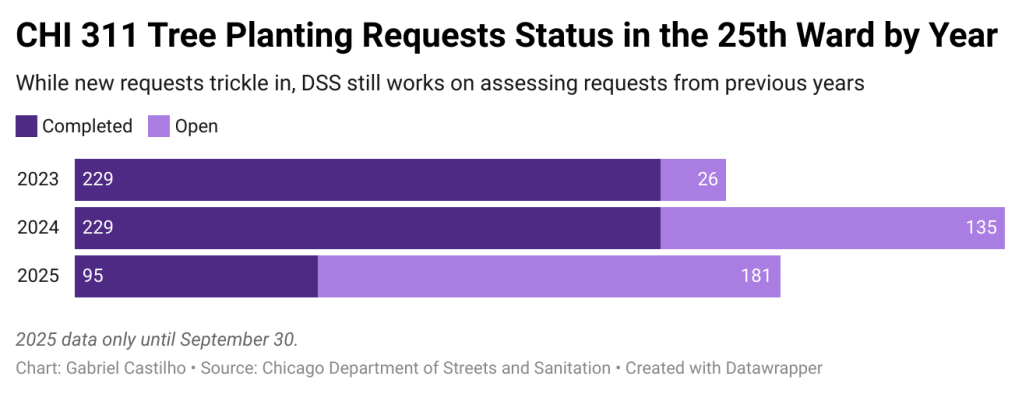 Through the CHI 311 service, Pilsen residents can request trees be planted on their sidewalks. According to the Chicago Department of Streets and Sanitation, out of the 276 tree planting requests filed this year, only about a third have been completed – a 32 percentage point decrease from last year’s.